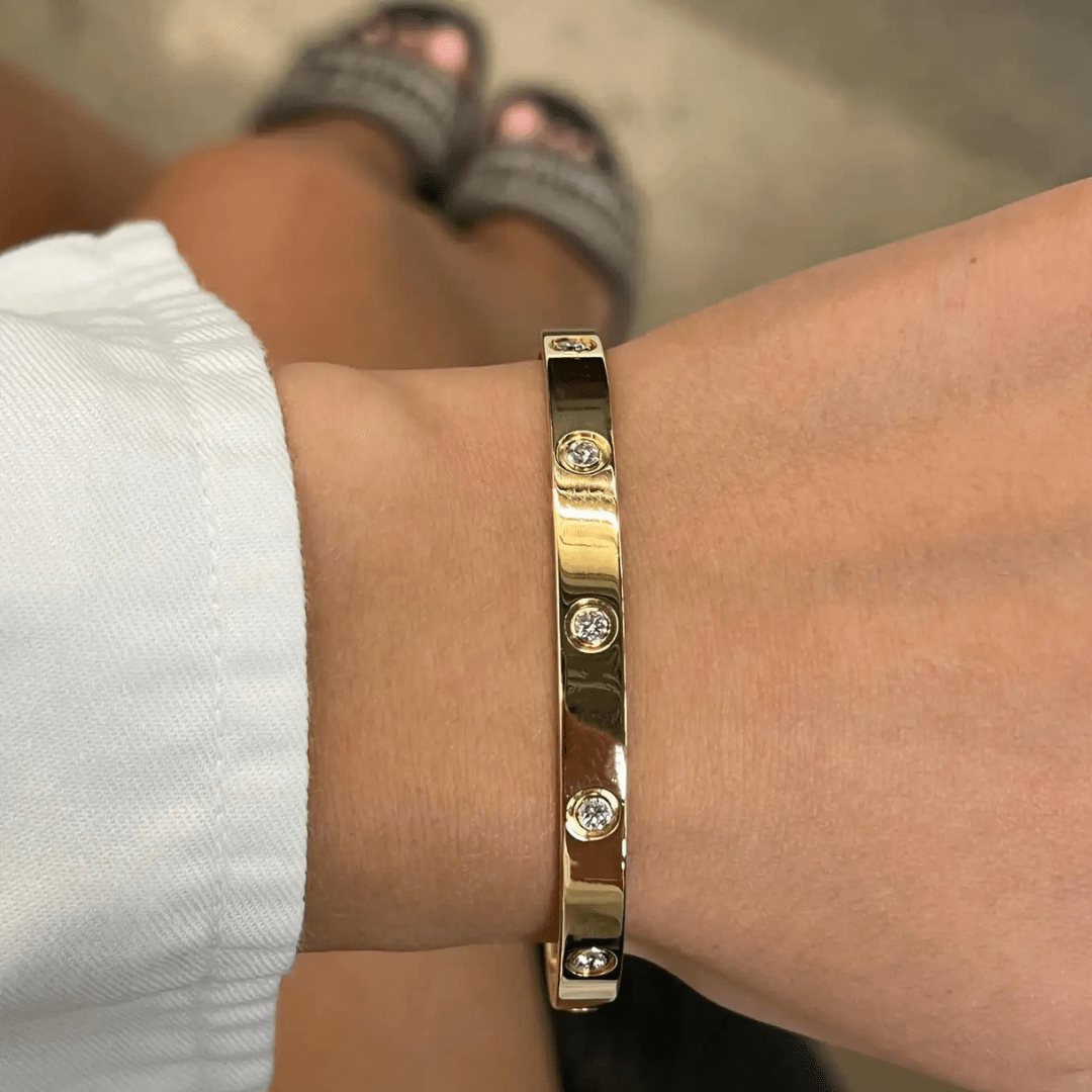 Elevate your style with our Bangle Bracelet, available in three luxurious plating options: radiant gold, sleek silver, and elegant rose gold. This exquisite piece is not only a symbol of enduring love and commitment but also a fashion statement that will make you look and feel truly luxurious.